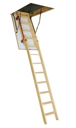 Чердачная лестница LDK, изготовлена из сосновой древесины высшего качества. Укомплектована утепленной крышкой люка, облицованной ДВП белого цвета, идеально вписывающейся в интерьер в светлых тонах. Лестница состоит из двух секций, одна из которых закреплена на крышке люка, а другая спускается вертикально вниз по металлическим фиксаторам. Такая лестница предназначена для помещений, где нет места для складных трех или четырех сегментных лестниц. Лестница отлично сохраняет тепло, за счет крышки с утеплителем, толщина которой равна 36 мм. Безопасна, проста и удобна в процессе эксплуатации, как и лестницы Smart и Komfort, но в тоже время позволяет сэкономить драгоценное пространство в доме.